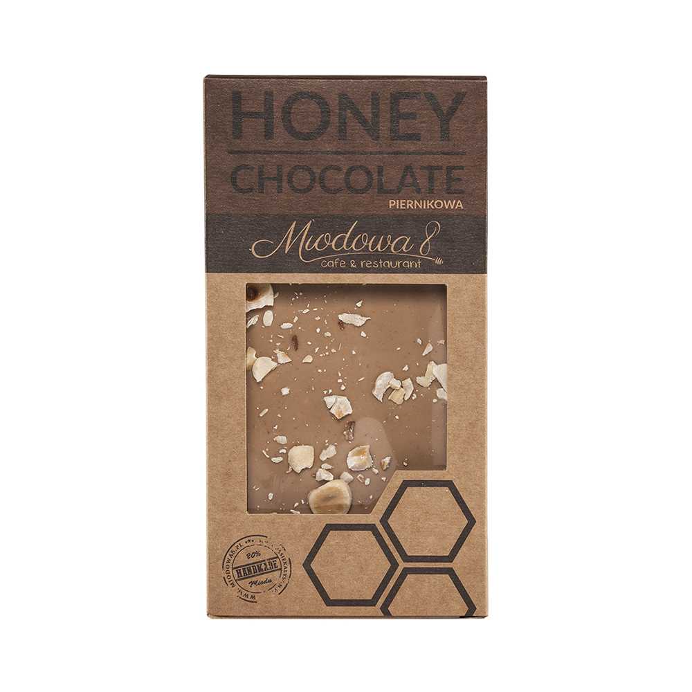 Biała czekolada o smaku piernika. Czekolada tworzona ręcznie w restauracji Miodowa8 w Wadowicach przez mistrzów swego fachu z wykorzystaniem najlepszej belgijskiej czekolady. Składniki: biała czekolada (cukier, masło kakaowe, mleko pełne w proszku, emulgator {lecytyna sojowa}, aromat0 miód, orzechy laskowe, przyprawa do piernika. Przechowywać w suchym i chłodnym miejscu.