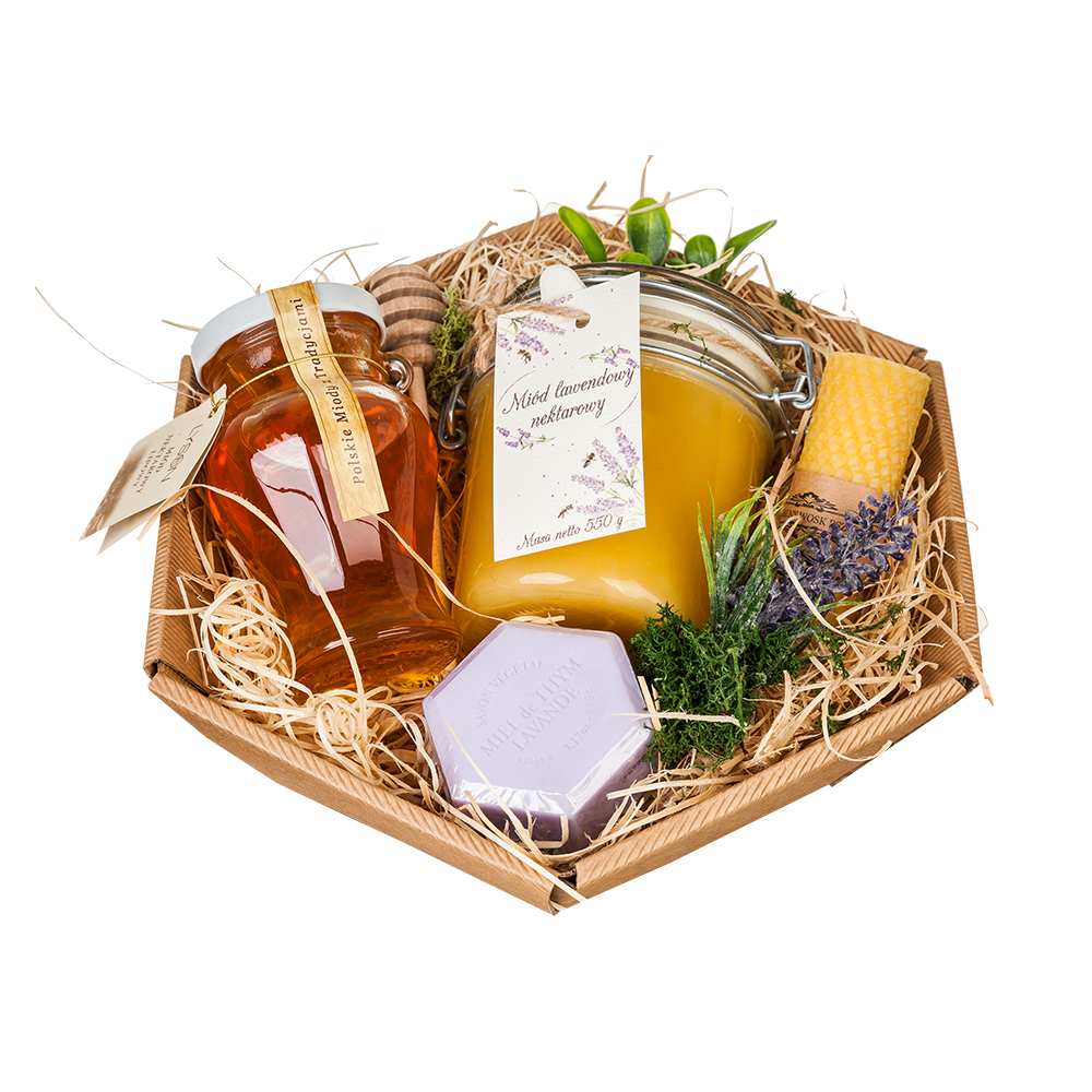 Zestaw Lawendowy Upominek składa się z Polskiego miodu lipowego amfora 270g, Miodu lawendowego w słoiku z klamrą 550g, Mydła miodowego z lawendą 100g, Świecy z węzy pszczelej w kolorze naturalnym wys 10cm oraz Nabieraka.