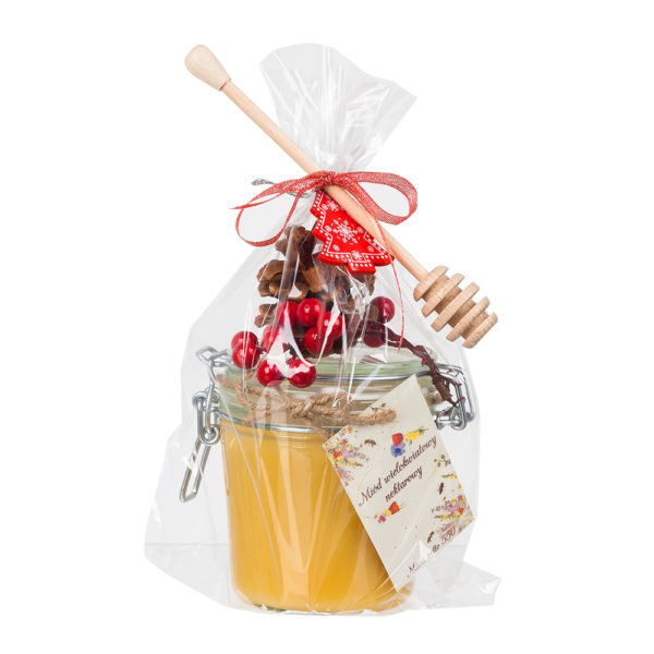 Miód wielokwiatowy z klamrą 550g Miód wielokwiatowy zbierany jest przez pszczoły przez cały okres wiosenno-letni z kwiatów rosnących na polach, łąkach i w lasach. W zależności od terminu zbioru miód wielokwiatowy może mieć różną barwę, od jasnokremowej do herbacianej. Proces krystalizacji sprawia, że miód wielokwiatowy zmienia barwę na jasnoszarą lub jasnobrązową. W smaku jest łagodny i słodki, zależy to jednak od składu nektaru. Niekiedy dominuje smak określonego nektaru, np. lipy. Ze względu na łagodny smak, miód ten polecany jest szczególnie dla dzieci.