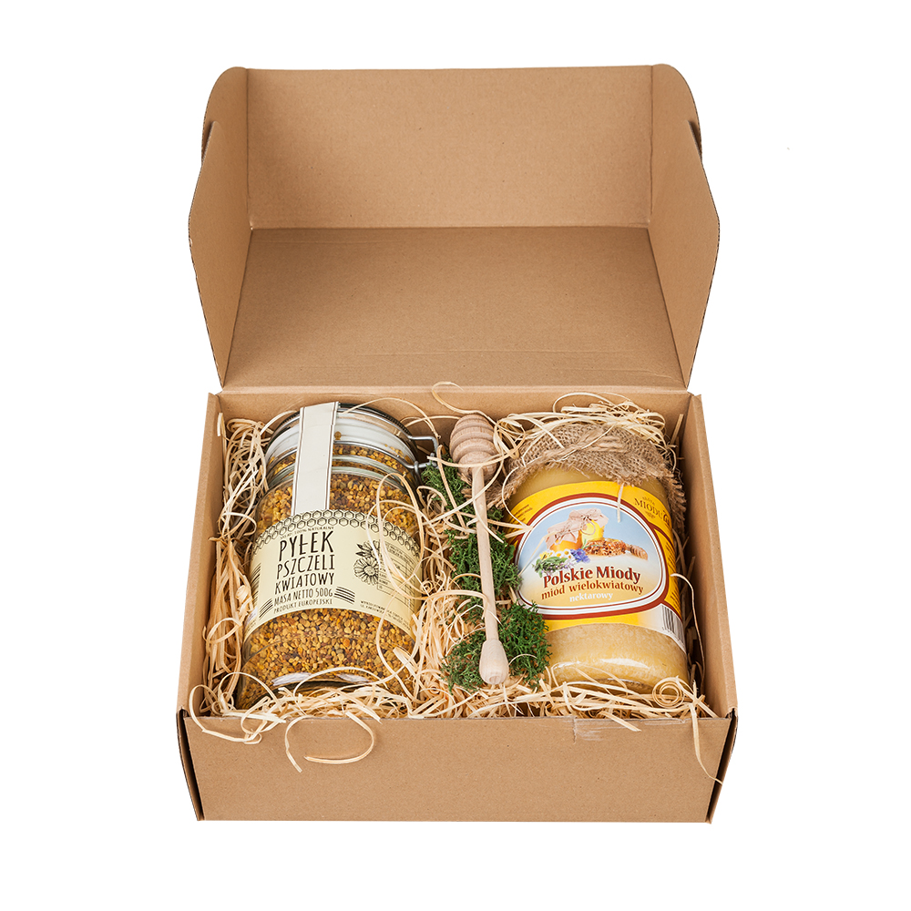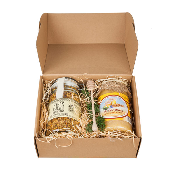 Zestaw Zdrowy Duet – zawiera w sobie PYŁEK W SŁOIKU Z KLAMRĄ 500G, MIÓD WIELOKWIATOWY 1KG oraz NABIERAK
